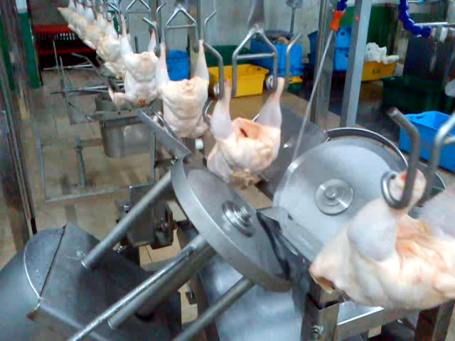 The Automatic 9-Piece Cut System is a fully automatic system that cut up birds into serving size. The system is a combination of 7 machines that cut up different parts of a bird. Each machine has round blades rotating at high speed to effectively cut up birds. The function of machines is buttocks cutting, chicken wings cutting, whole breasts cutting, split cutting, rib cutting, thigh cutting and drumstick unloading. Advantages of using this system is save labour, fully automatic and maintain hygiene.