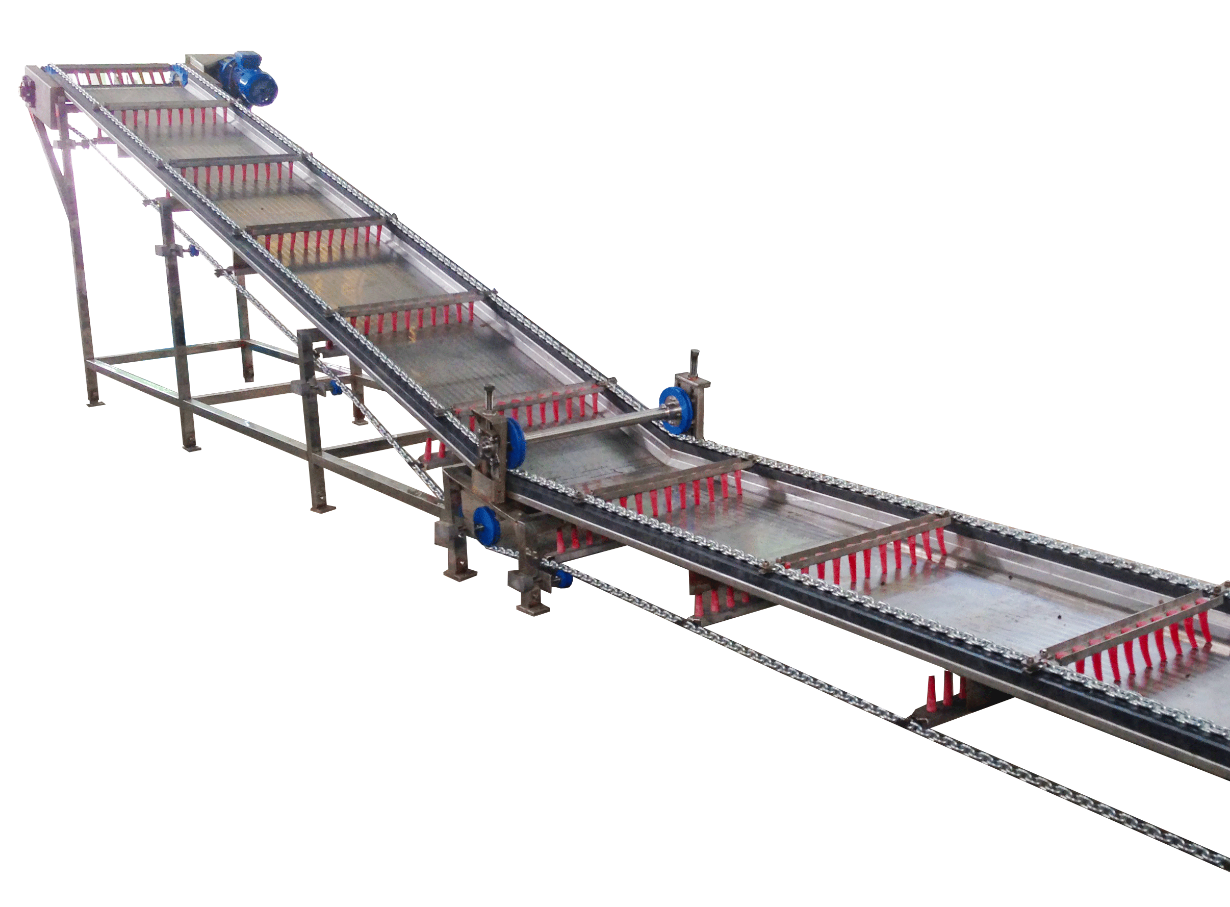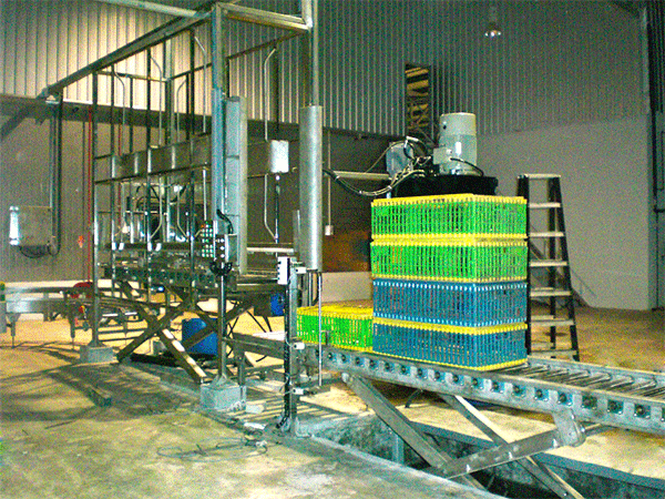 The Automatic Crate Reloader automatically supplies the crates containing the birds to the hanging department. The crates containing the birds are offloaded manually from truck and placed onto the unloading platform. The unloading platform is equipped with de-stacking device to unload the crates for manual withdrawal of the birds. The machine reduces manual labour and extends the life span of the crates.
