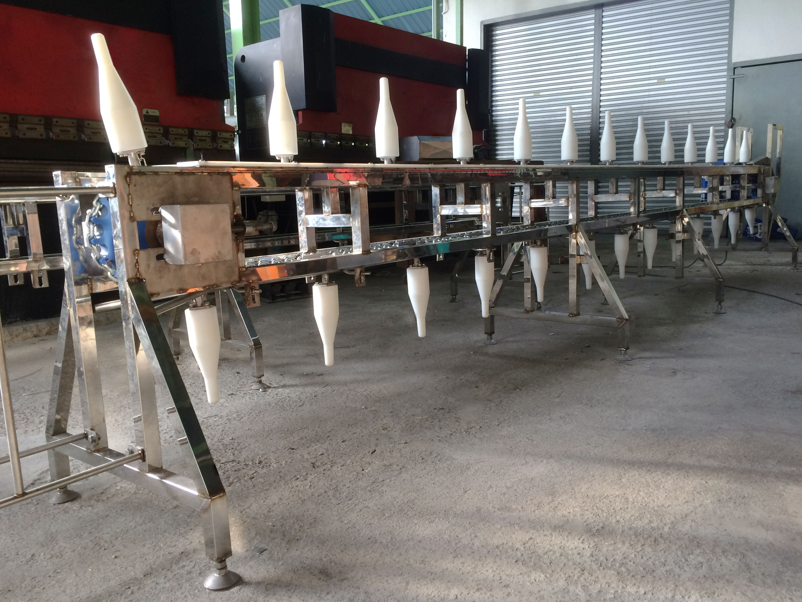 The Roller Conveyor moves the crates containing the birds to the hanging area easily and effortlessly. It is made of stainless steel for durable and easy to clean. Rollers are fitted with quality bearings so the crates can move easily. Height of the conveyor can be adjusted to suit the structure of the plant. This device reduces manual labour and maintains hygiene.