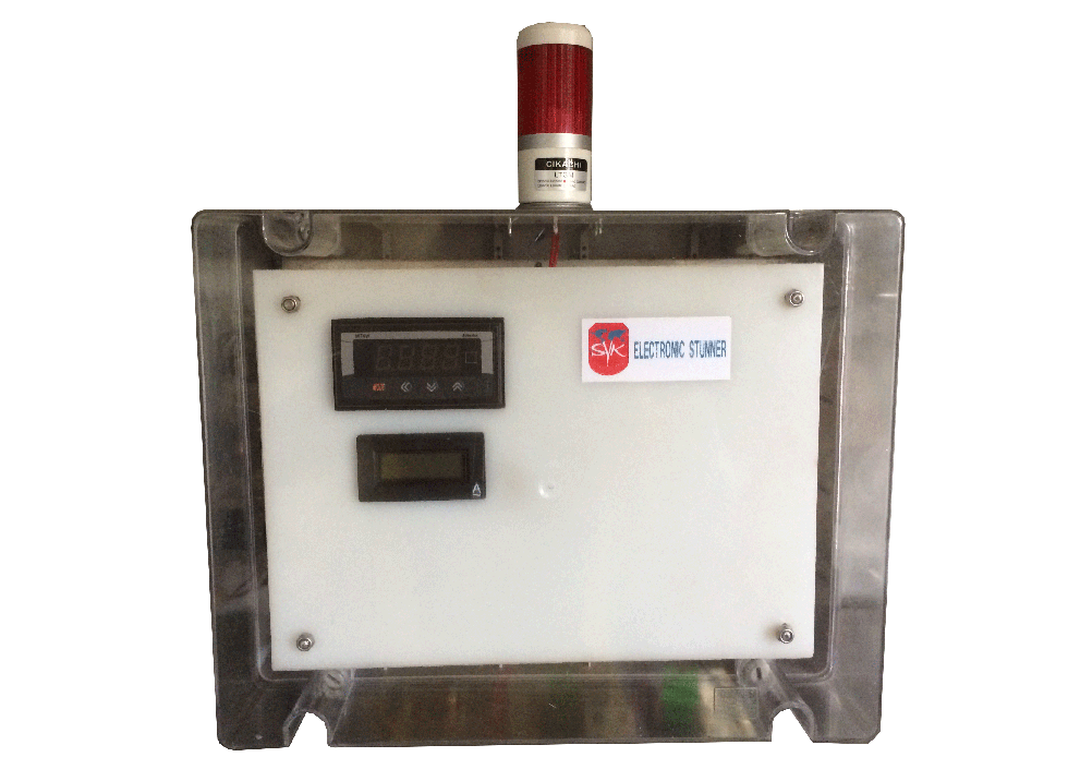 The Stunner Control Panel controls the voltage of the electric stunner. Simple operation and safety feature is our top concern when using our Stunner Control Panel. A tower light installed on top of the control panel indicates the operation of the stunner. Circuit breaker is installed in the control panel for safety during operation. Our previous experience of engineering in electrical and electronics has led us to introduce the 9th generation Stunner Control Panel featuring frequency control system.
